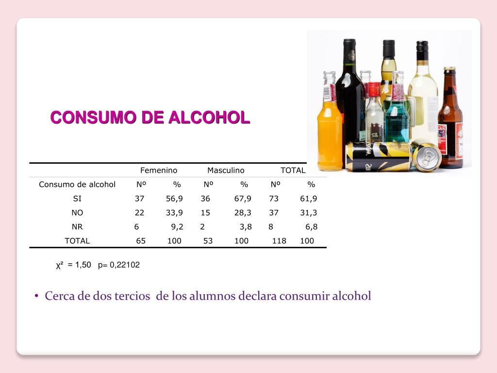CONSUMO DE ALCOHOL χ² = 1,50 p= 0,22102 • Cerca de dos tercios de los alumnos declara consumir alcohol