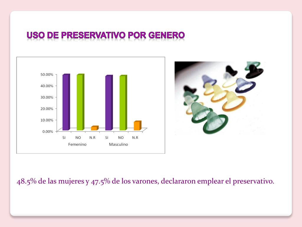 USO DE preservativo por genero 48.5% de las mujeres y 47.5% de los varones, declararon emplear el preservativo.