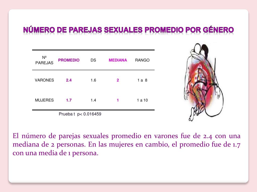 Número de parejas sexuales promedio por género Prueba t p< 0.016459 El número de parejas sexuales promedio en varones fue de 2.4 con una mediana de 2 personas. En las mujeres en cambio, el promedio fue de 1.7 con una media de 1 persona.