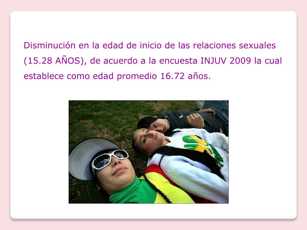 Disminución en la edad de inicio de las relaciones sexuales (15.28 AÑOS), de acuerdo a la encuesta INJUV 2009 la cual establece como edad promedio 16.72 años.