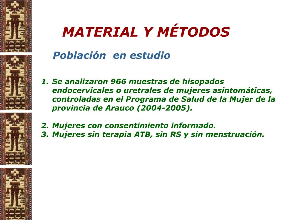 MATERIAL Y MÉTODOS Población en estudio • Se analizaron 966 muestras de hisopados endocervicales o uretrales de mujeres asintomáticas, controladas en el Programa de Salud de la Mujer de la provincia de Arauco (2004-2005). • Mujeres con consentimiento informado. • Mujeres sin terapia ATB, sin RS y sin menstruación.
