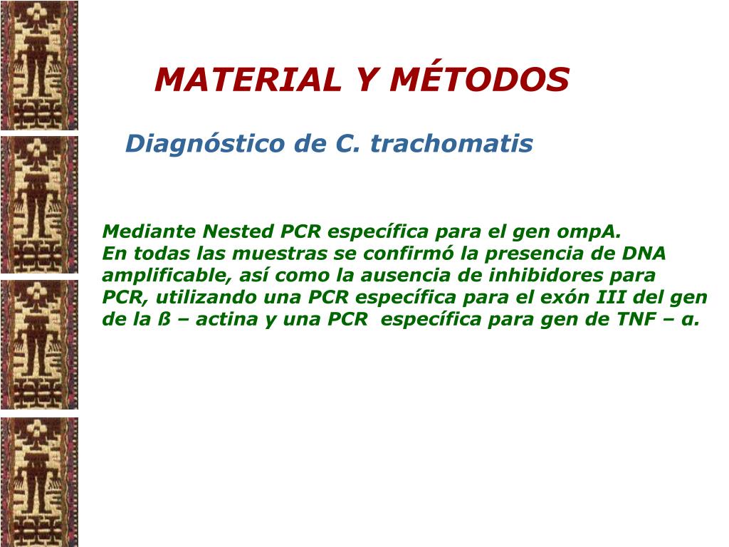 MATERIAL Y MÉTODOS Diagnóstico de C. trachomatis Mediante Nested PCR específica para el gen ompA. En todas las muestras se confirmó la presencia de DNA amplificable, así como la ausencia de inhibidores para PCR, utilizando una PCR específica para el exón III del gen de la ß – actina y una PCR específica para gen de TNF – α.