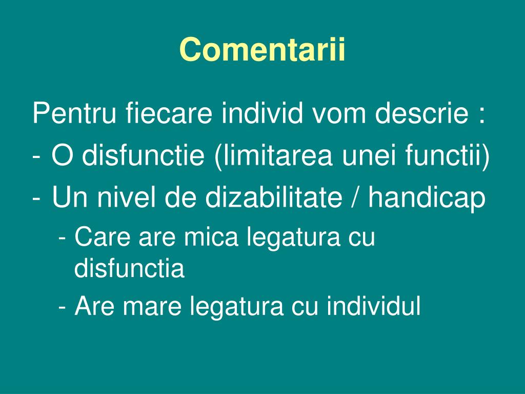 Comentarii Pentru fiecare individ vom descrie : • O disfunctie (limitarea unei functii) • Un nivel de dizabilitate / handicap • Care are mica legatura cu disfunctia • Are mare legatura cu individul
