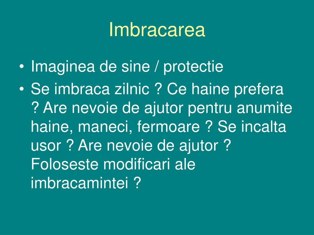 Imbracarea • Imaginea de sine / protectie • Se imbraca zilnic ? Ce haine prefera ? Are nevoie de ajutor pentru anumite haine, maneci, fermoare ? Se incalta usor ? Are nevoie de ajutor ? Foloseste modificari ale imbracamintei ?