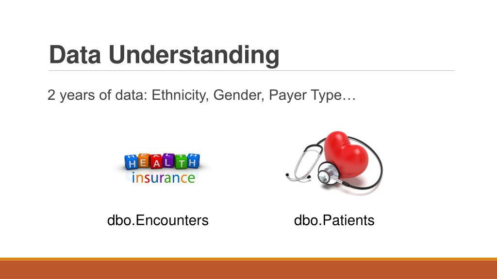 Data Understanding • 2 years of data: Ethnicity, Gender, Payer Type… dbo.Patients dbo.Encounters