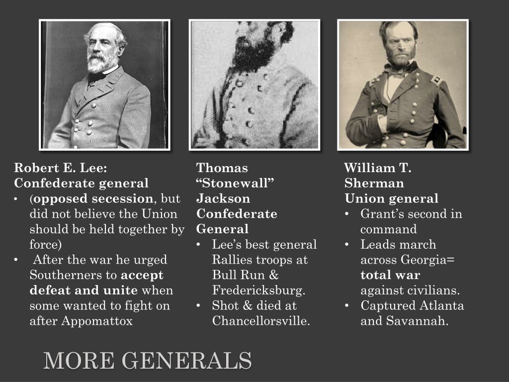 Robert E. Lee: Confederate general • (opposed secession, but did not believe the Union should be held together by force) • After the war he urged Southerners to accept defeat and unite when some wanted to fight on after Appomattox • Thomas “Stonewall” Jackson • Confederate General • Lee’s best general Rallies troops at Bull Run & Fredericksburg. • Shot & died at Chancellorsville. • William T. Sherman • Union general • Grant’s second in command • Leads march across Georgia= total war against civilians. • Captured Atlanta and Savannah. More Generals