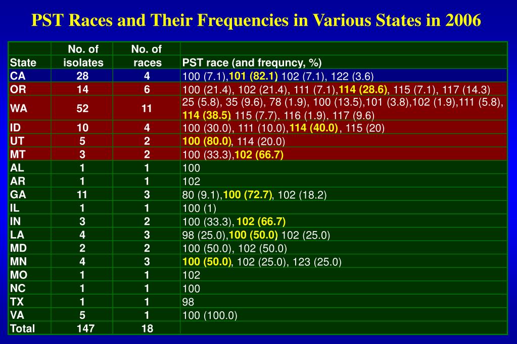 No. of No. of State isolates races PST race (and frequncy, %) CA 28 4 101 (82.1) 100 (7.1), , 102 (7.1), 122 (3.6) OR 14 6 114 (28.6) 100 (21.4), 102 (21.4), 111 (7.1), , 115 (7.1), 117 (14.3) 25 (5.8), 35 (9.6), 78 (1.9), 100 (13.5),101 (3.8),102 (1.9),111 (5.8), WA 52 11 114 (38.5) , 115 (7.7), 116 (1.9), 117 (9.6) ID 10 4 114 (40.0) 100 (30.0), 111 (10.0), , 115 (20) UT 5 2 100 (80.0) , 114 (20.0) MT 3 2 100 (33.3), 102 (66.7) AL 1 1 100 AR 1 1 102 GA 11 3 100 (72.7) 80 (9.1), , 102 (18.2) IL 1 1 100 (1) IN 3 2 102 (66.7) 100 (33.3), LA 4 3 100 (50.0) 98 (25.0), , 102 (25.0) MD 2 2 100 (50.0), 102 (50.0) MN 4 3 100 (50.0) , 102 (25.0), 123 (25.0) MO 1 1 102 NC 1 1 100 TX 1 1 98 VA 5 1 100 (100.0) Total 147 18 PST Races and Their Frequencies in Various States in 2006
