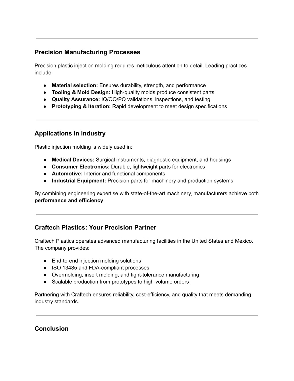 Precision Manufacturing Processes Precision plastic injection molding requires meticulous attention to detail. Leading practices include: ● Material selection: Ensures durability, strength, and performance ● Tooling & Mold Design: High-quality molds produce consistent parts ● Quality Assurance: IQ/OQ/PQ validations, inspections, and testing ● Prototyping & Iteration: Rapid development to meet design specifications Applications in Industry Plastic injection molding is widely used in: ● Medical Devices: Surgical instruments, diagnostic equipment, and housings ● Consumer Electronics: Durable, lightweight parts for electronics ● Automotive: Interior and functional components ● Industrial Equipment: Precision parts for machinery and production systems By combining engineering expertise with state-of-the-art machinery, manufacturers achieve both performance and efficiency. Craftech Plastics: Your Precision Partner Craftech Plastics operates advanced manufacturing facilities in the United States and Mexico. The company provides: ● End-to-end injection molding solutions ● ISO 13485 and FDA-compliant processes ● Overmolding, insert molding, and tight-tolerance manufacturing ● Scalable production from prototypes to high-volume orders Partnering with Craftech ensures reliability, cost-efficiency, and quality that meets demanding industry standards. Conclusion