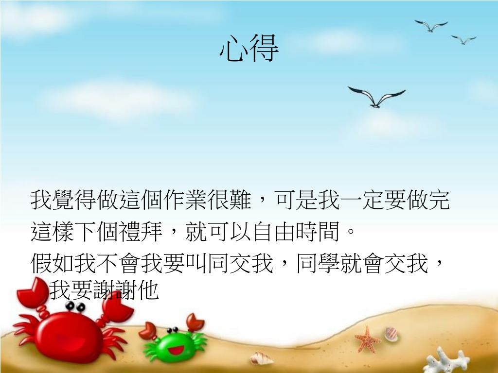 心得 我覺得做這個作業很難,可是我一定要做完 這樣下個禮拜,就可以自由時間。 假如我不會我要叫同交我,同學就會交我,我要謝謝他