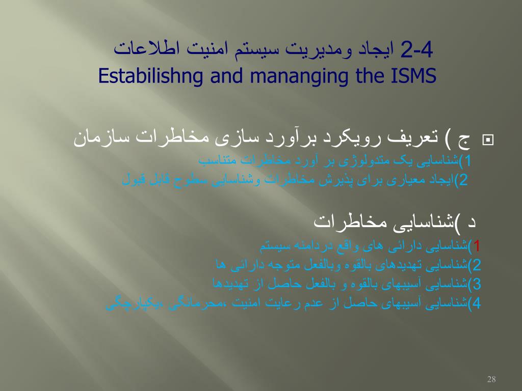 4-2 ایجاد ومدیریت سیستم امنیت اطلاعات Estabilishng and mananging the ISMS • ج ) تعریف رویکرد برآورد سازی مخاطرات سازمان 1)شناسایی یک متدولوژی بر آورد مخاطرات متناسب 2)ایجاد معیاری برای پذیرش مخاطرات وشناسایی سطوح قابل قبول د )شناسایی مخاطرات 1)شناسایی دارائی های واقع دردامنه سیستم 2)شناسایی تهدیدهای بالقوه وبالفعل متوجه دارائی ها 3)شناسایی آسیبهای بالقوه و بالفعل حاصل از تهدیدها 4)شناسایی آسیبهای حاصل از عدم رعایت امنیت ،محرمانگی ،یکپارچگی