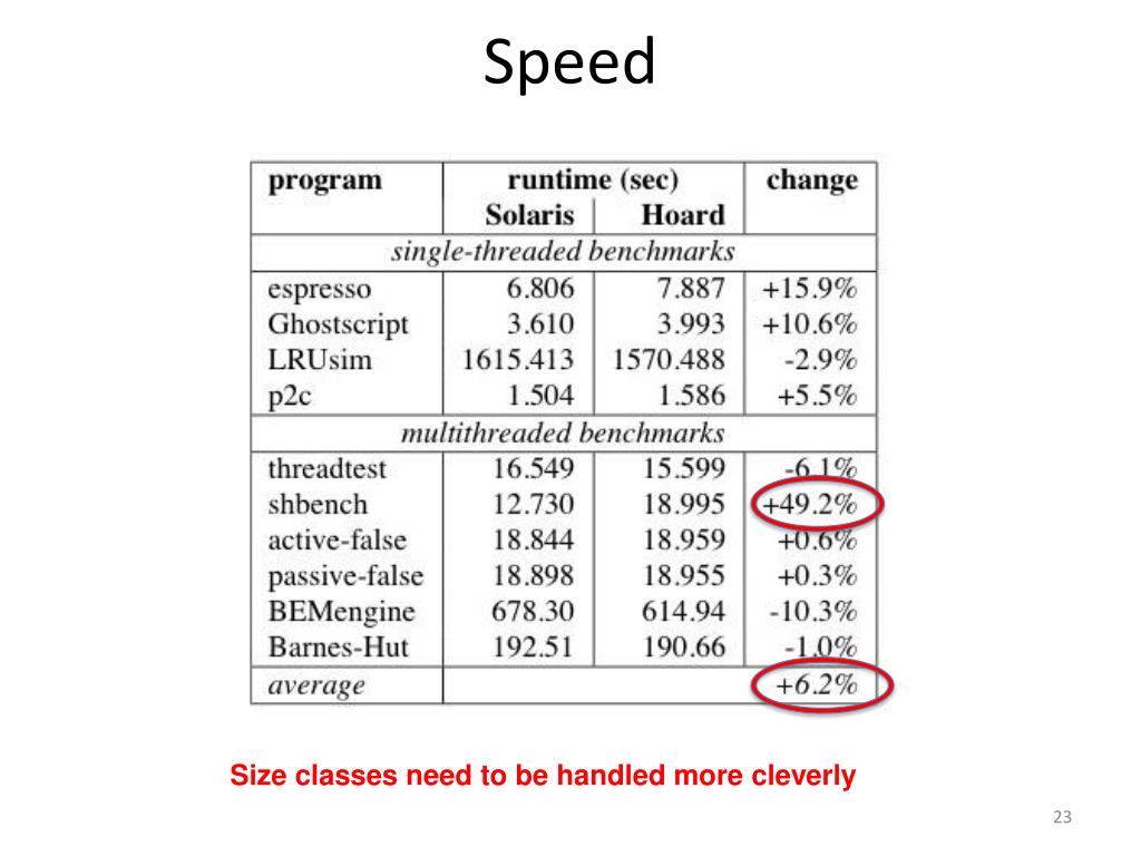 Hoard Conclusions • Speed: Excellent • As fast as a uniprocessor allocator on one processor • amortized O(1) cost • 1 lock for malloc, 2 for free • Scalability: Excellent • Scales linearly with the number of processors • Avoids false sharing • Fragmentation: Very good • Worst-case is provably close to ideal • Actual observed fragmentation is low