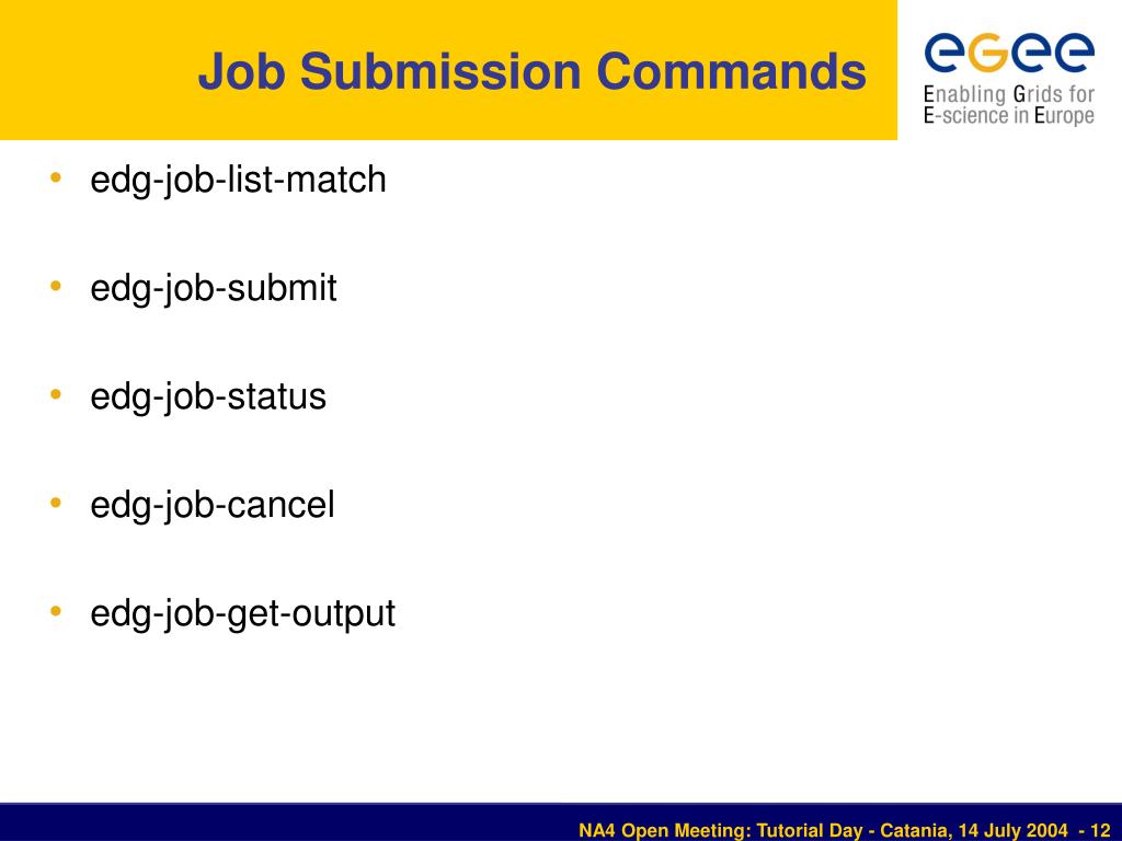 NA4 Open Meeting: Tutorial Day Catania 14 July 2004 www.eu-egee.org Job SubmissionGiuseppe La RoccaEGEE NA4 Generic ApplicationsINFN Catania EGEE is a project funded by the European Union under contract IST-2003-508833