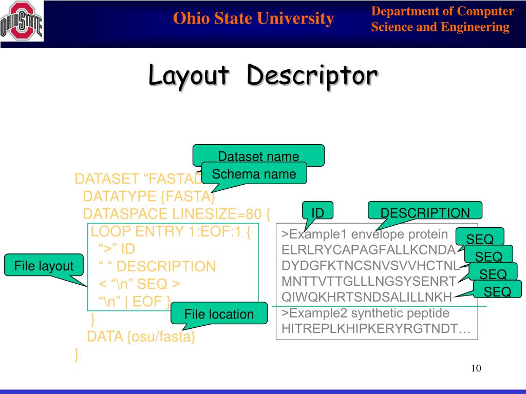 Layout Descriptor Dataset name Schema name DATASET “FASTAData” { DATATYPE {FASTA} DATASPACE LINESIZE=80 { LOOP ENTRY 1:EOF:1 { “>” ID “ “ DESCRIPTION < “\n” SEQ > “\n” | EOF } } DATA {osu/fasta} } ID DESCRIPTION >Example1 envelope protein ELRLRYCAPAGFALLKCNDA DYDGFKTNCSNVSVVHCTNL MNTTVTTGLLLNGSYSENRT QIWQKHRTSNDSALILLNKH >Example2 synthetic peptide HITREPLKHIPKERYRGTNDT… SEQ SEQ File layout SEQ SEQ File location