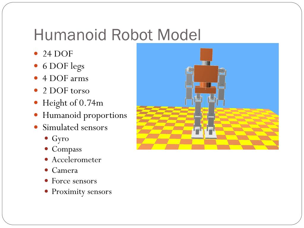 Model use in Design • Design aid for finding required servo/joint strength • To design control algorithms with sensor input long before a physical hardware is available. • Design Inverse Kinematics Algorithm • Design Zero Moment Point Algorithm • Test viable walking gaits • Test strategies for fall recovery. • Control code very similar to code implemented in hardware controller.