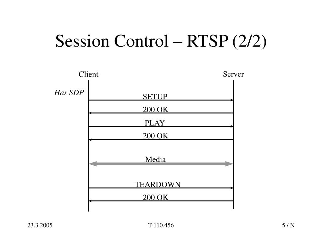 Session Control – RTSP (2/2) Server Client Has SDP SETUP 200 OK PLAY 200 OK Media TEARDOWN 200 OK T-110.456