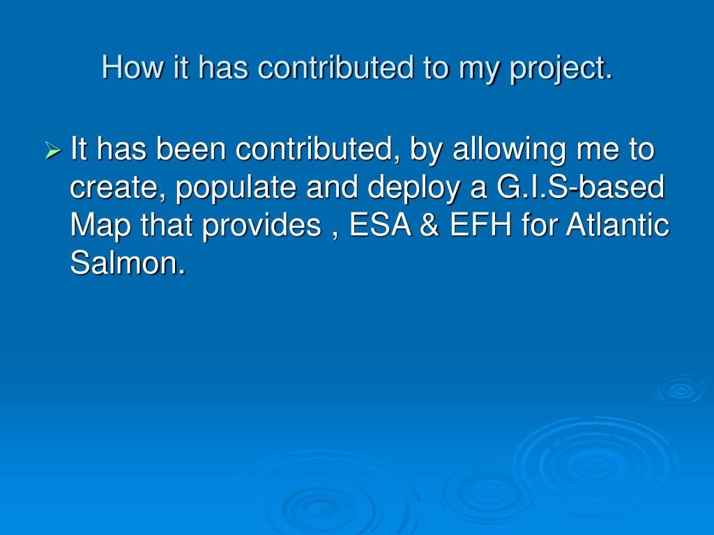 How it has contributed to my project. • It has been contributed, by allowing me to create, populate and deploy a G.I.S-based Map that provides , ESA & EFH for Atlantic Salmon.