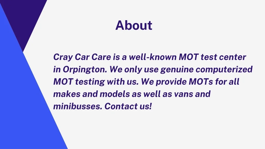 About • Cray Car Care is a well-known MOT test center in Orpington. We only use genuine computerized MOT testing with us. We provide MOTs for all makes and models as well as vans and minibusses. Contact us!