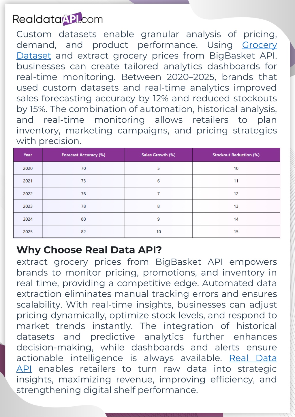 Custom datasets enable granular analysis of pricing, demand, and product performance. Using Dataset and extract grocery prices from BigBasket API, businesses can create tailored analytics dashboards for real-time monitoring. Between 2020–2025, brands that used custom datasets and real-time analytics improved sales forecasting accuracy by 12% and reduced stockouts by 15%. The combination of automation, historical analysis, and real-time monitoring allows retailers to plan inventory, marketing campaigns, and pricing strategies with precision. Grocery Why Choose Real Data API? extract grocery prices from BigBasket API empowers brands to monitor pricing, promotions, and inventory in real time, providing a competitive edge. Automated data extraction eliminates manual tracking errors and ensures scalability. With real-time insights, businesses can adjust pricing dynamically, optimize stock levels, and respond to market trends instantly. The integration of historical datasets and predictive analytics further enhances decision-making, while dashboards and alerts ensure actionable intelligence is always available. Real Data API enables retailers to turn raw data into strategic insights, maximizing revenue, improving efficiency, and strengthening digital shelf performance.