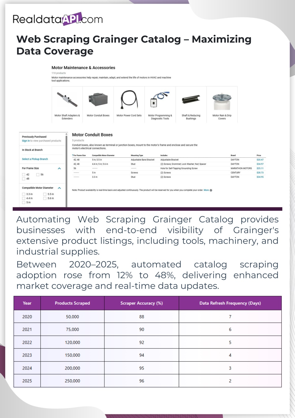 9. Web Scraping Grainger Catalog – Maximizing Data Coverage Automating Web Scraping Grainger Catalog provides businesses with end-to-end visibility of Grainger's extensive product listings, including tools, machinery, and industrial supplies. Between 2020–2025, automated catalog scraping adoption rose from 12% to 48%, delivering enhanced market coverage and real-time data updates.