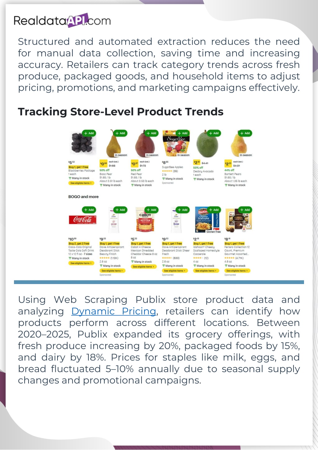 3. Structured and automated extraction reduces the need for manual data collection, saving time and increasing accuracy. Retailers can track category trends across fresh produce, packaged goods, and household items to adjust pricing, promotions, and marketing campaigns effectively. Tracking Store-Level Product Trends Using Web Scraping Publix store product data and analyzing Dynamic Pricing, retailers can identify how products perform across different locations. Between 2020–2025, Publix expanded its grocery offerings, with fresh produce increasing by 20%, packaged foods by 15%, and dairy by 18%. Prices for staples like milk, eggs, and bread fluctuated 5–10% annually due to seasonal supply changes and promotional campaigns.