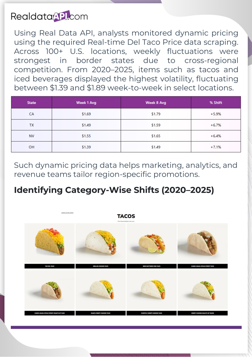 Using Real Data API, analysts monitored dynamic pricing using the required Real-time Del Taco Price data scraping. Across 100+ U.S. locations, weekly fluctuations were strongest in border states competition. From 2020–2025, items such as tacos and iced beverages displayed the highest volatility, fluctuating between $1.39 and $1.89 week-to-week in select locations. due to cross-regional Such dynamic pricing data helps marketing, analytics, and revenue teams tailor region-specific promotions. Identifying Category-Wise Shifts (2020–2025)