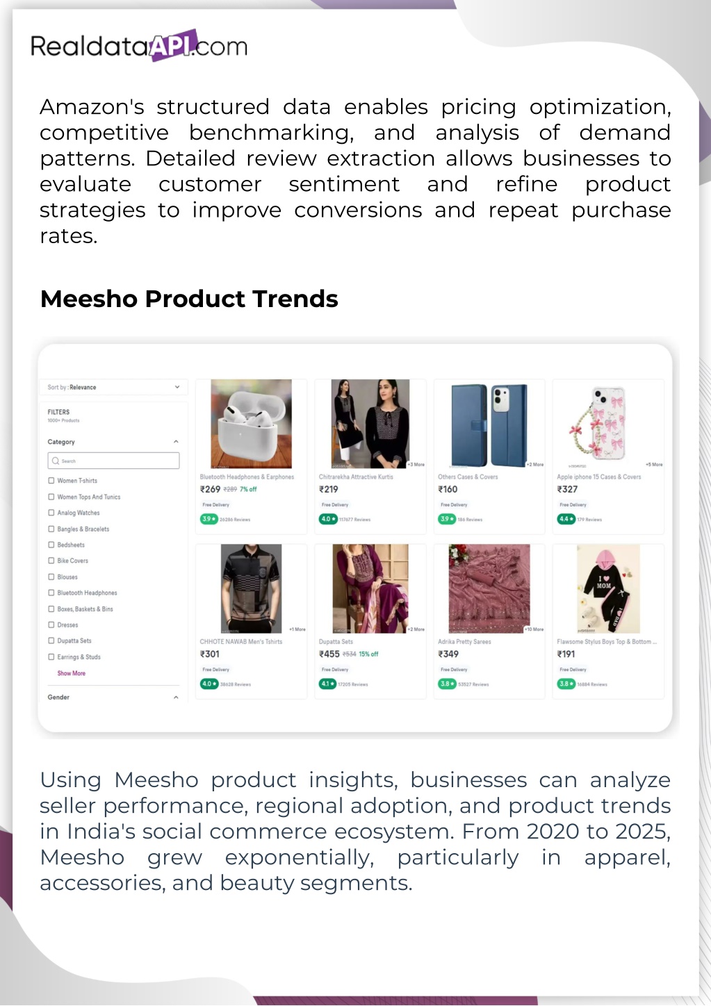 Amazon's structured data enables pricing optimization, competitive benchmarking, and analysis of demand patterns. Detailed review extraction allows businesses to evaluate customer sentiment strategies to improve conversions and repeat purchase rates. and refine product Meesho Product Trends Using Meesho product insights, businesses can analyze seller performance, regional adoption, and product trends in India's social commerce ecosystem. From 2020 to 2025, Meesho grew exponentially, particularly in apparel, accessories, and beauty segments.