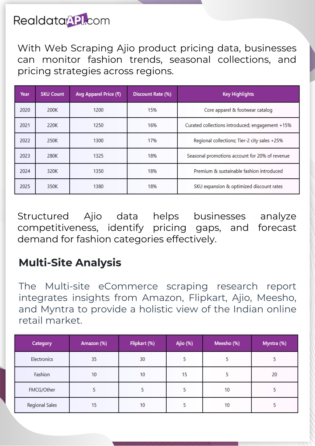 With Web Scraping Ajio product pricing data, businesses can monitor fashion trends, seasonal collections, and pricing strategies across regions. Structured competitiveness, identify pricing gaps, and forecast demand for fashion categories effectively. Ajio data helps businesses analyze Multi-Site Analysis The Multi-site eCommerce scraping research report integrates insights from Amazon, Flipkart, Ajio, Meesho, and Myntra to provide a holistic view of the Indian online retail market.