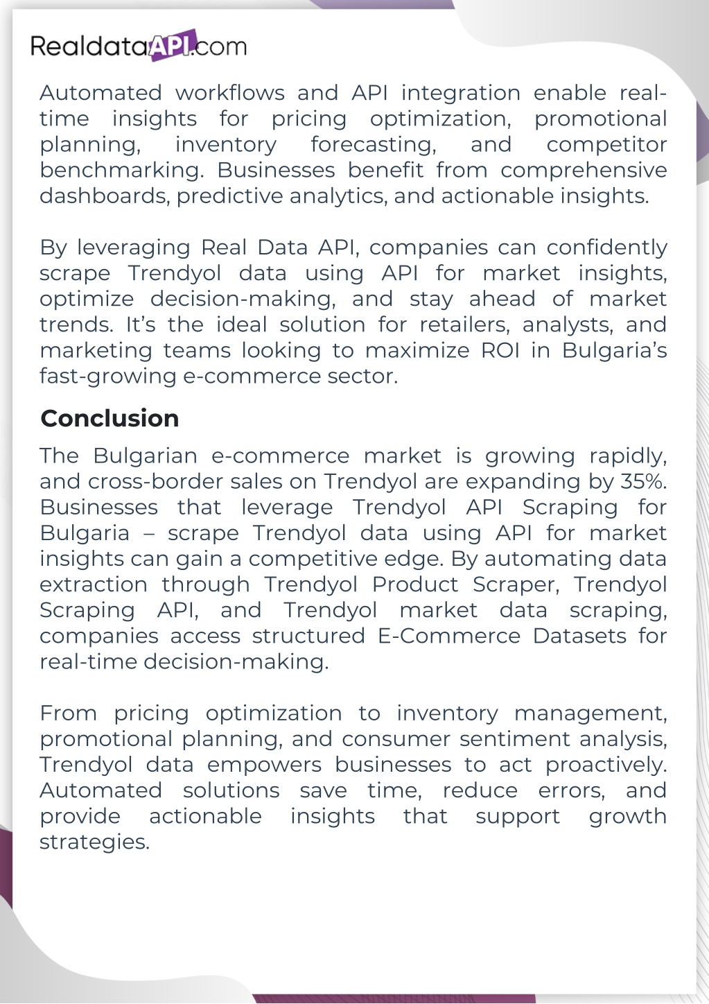 Automated workflows and API integration enable real- time insights for pricing optimization, promotional planning, inventory forecasting, benchmarking. Businesses benefit from comprehensive dashboards, predictive analytics, and actionable insights. and competitor By leveraging Real Data API, companies can confidently scrape Trendyol data using API for market insights, optimize decision-making, and stay ahead of market trends. It’s the ideal solution for retailers, analysts, and marketing teams looking to maximize ROI in Bulgaria’s fast-growing e-commerce sector. Conclusion The Bulgarian e-commerce market is growing rapidly, and cross-border sales on Trendyol are expanding by 35%. Businesses that leverage Trendyol API Scraping for Bulgaria – scrape Trendyol data using API for market insights can gain a competitive edge. By automating data extraction through Trendyol Product Scraper, Trendyol Scraping API, and Trendyol market data scraping, companies access structured E-Commerce Datasets for real-time decision-making. From pricing optimization to inventory management, promotional planning, and consumer sentiment analysis, Trendyol data empowers businesses to act proactively. Automated solutions save time, reduce errors, and provide actionable insights strategies. that support growth