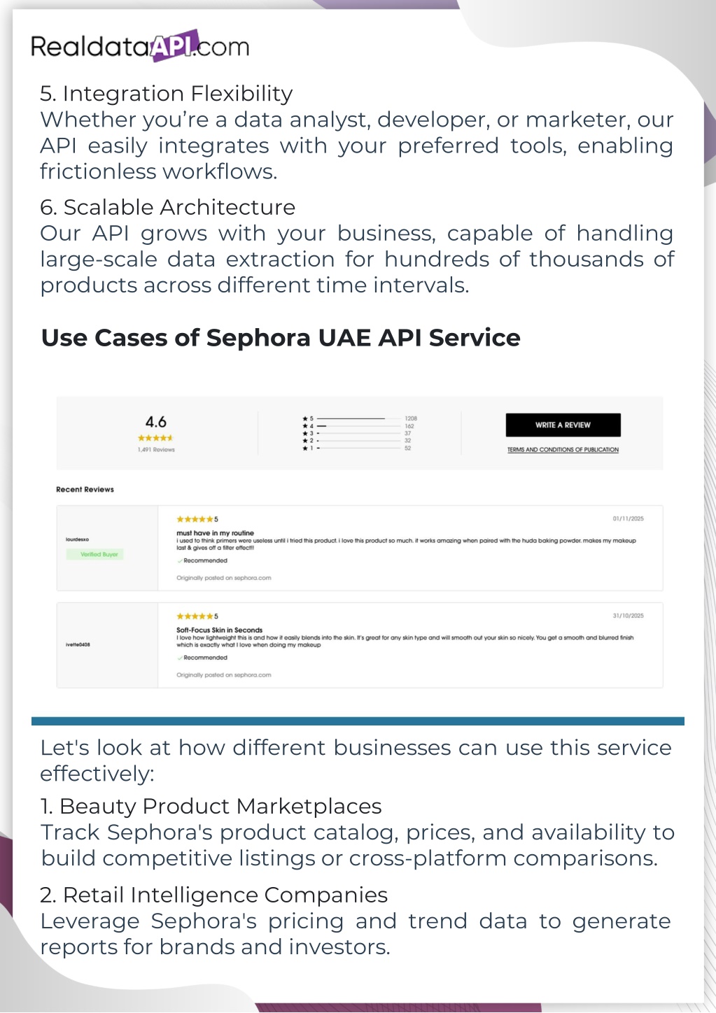 14. Why Choose Real Data API for Sephora UAE API Services At Real Data API, we specialize in building custom web scraping and API solutions for global eCommerce platforms. Our Distinguishing Factors: •Experience in Global Retail APIs: Expertise across platforms like Sephora, Ulta, Boots, and Watsons. •Data Accuracy: Enterprise-grade validation and error- handling. •Custom Scalability: Tailored solutions for startups, SMEs, and large-scale enterprises. •Compliance & Ethics: 100% adherence to regional data policies and legal guidelines. •Dedicated Support: assistance. 24/7 technical and analytical •Advanced Infrastructure: Cloud-based architecture for high performance and minimal latency. Whether you're a brand, retailer, or analytics provider, our Sephora Scraper helps you harness the full potential of beauty retail data — enabling faster, smarter, and data- driven growth.