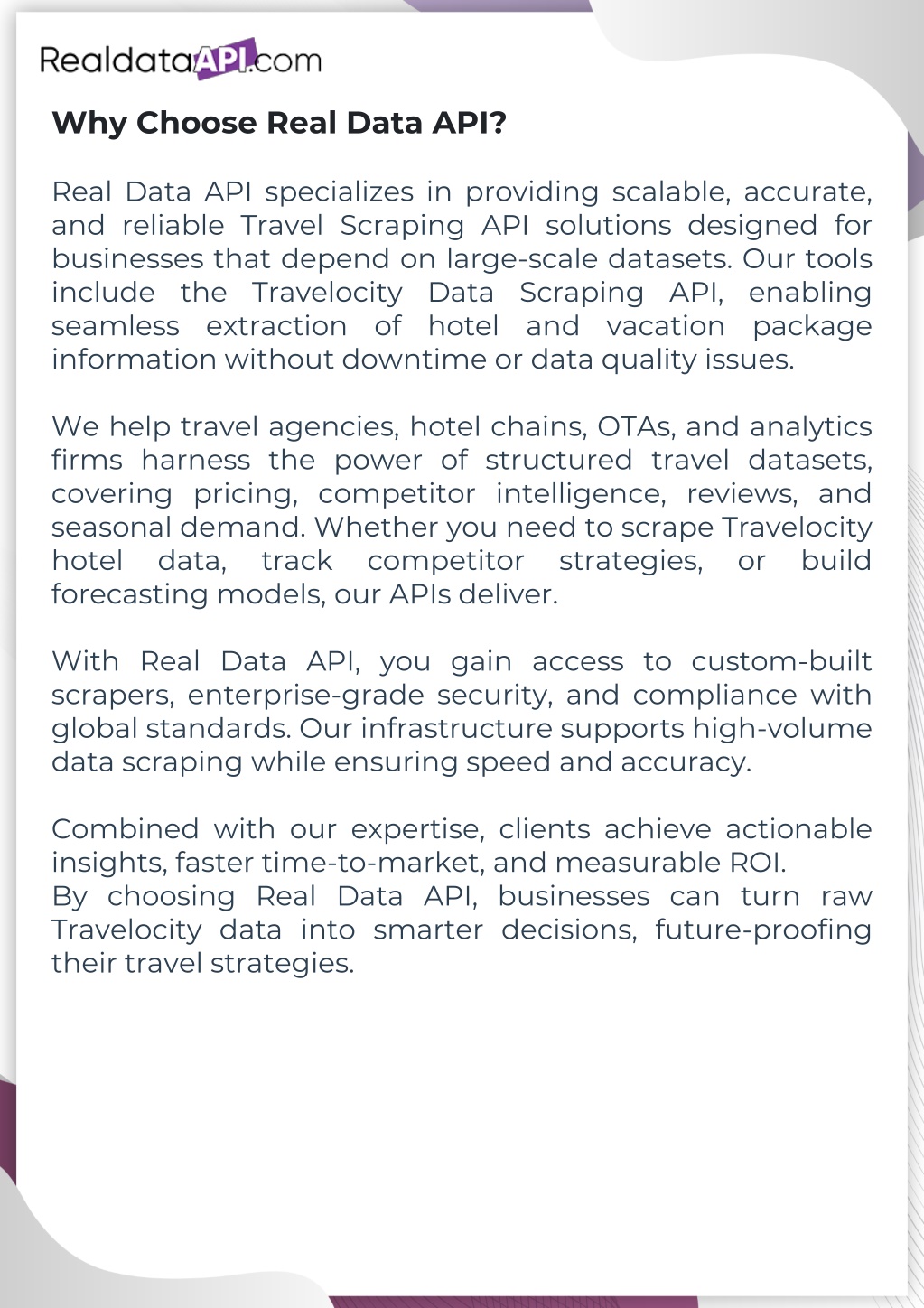 Why Choose Real Data API? Real Data API specializes in providing scalable, accurate, and reliable Travel Scraping API solutions designed for businesses that depend on large-scale datasets. Our tools include the Travelocity Data Scraping API, enabling seamless extraction of hotel and vacation package information without downtime or data quality issues. We help travel agencies, hotel chains, OTAs, and analytics firms harness the power of structured travel datasets, covering pricing, competitor intelligence, reviews, and seasonal demand. Whether you need to scrape Travelocity hotel data, track competitor strategies, or build forecasting models, our APIs deliver. With Real Data API, you gain access to custom-built scrapers, enterprise-grade security, and compliance with global standards. Our infrastructure supports high-volume data scraping while ensuring speed and accuracy. Combined with our expertise, clients achieve actionable insights, faster time-to-market, and measurable ROI. By choosing Real Data API, businesses can turn raw Travelocity data into smarter decisions, future-proofing their travel strategies.