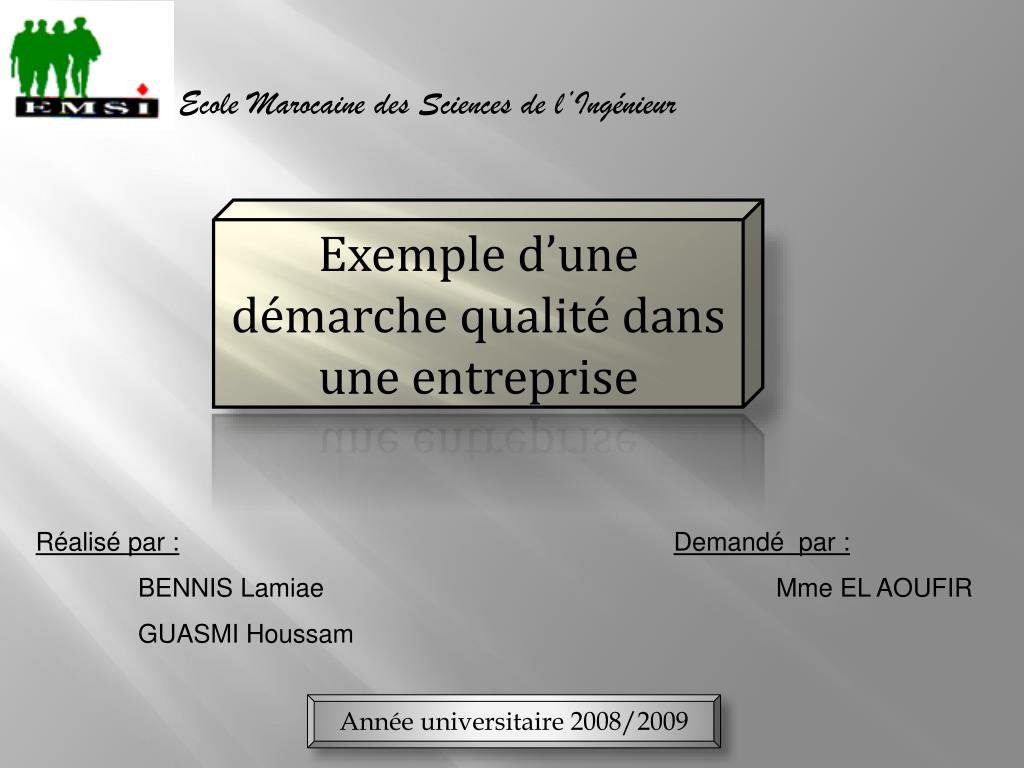 Ecole Marocaine des Sciences de l’Ingénieur Exemple d’une démarche qualité dans une entreprise Réalisé par : BENNIS Lamiae GUASMI Houssam Demandé par : Mme EL AOUFIR Année universitaire 2008/2009