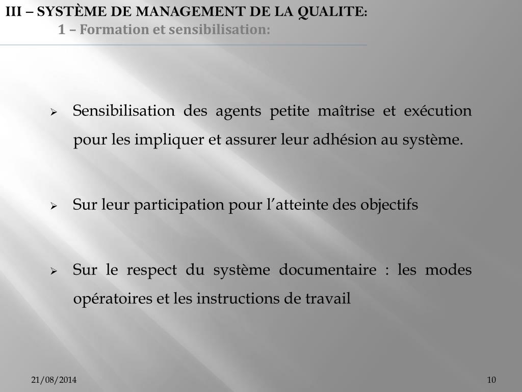 III – SYSTÈME DE MANAGEMENT DE LA QUALITE: 1 – Formation et sensibilisation: • Sensibilisation des agents petite maîtrise et exécution pour les impliquer et assurer leur adhésion au système. • Sur leur participation pour l’atteinte des objectifs • Sur le respect du système documentaire : les modes opératoires et les instructions de travail