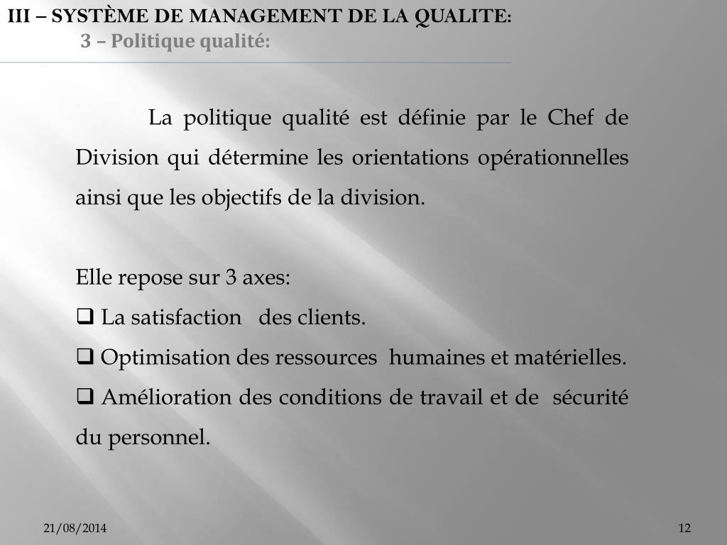 III – SYSTÈME DE MANAGEMENT DE LA QUALITE: 3 – Politique qualité: • La politique qualité est définie par le Chef de Division qui détermine les orientations opérationnelles ainsi que les objectifs de la division. • Elle repose sur 3 axes: • La satisfaction des clients. • Optimisation des ressources humaines et matérielles. • Amélioration des conditions de travail et de sécurité du personnel.