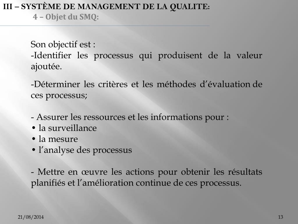 III – SYSTÈME DE MANAGEMENT DE LA QUALITE: 4 – Objet du SMQ: • Son objectif est : • Identifier les processus qui produisent de la valeur ajoutée. • Déterminer les critères et les méthodes d’évaluationde ces processus; • - Assurer les ressources et les informations pour : • • la surveillance • • la mesure • • l’analyse des processus • - Mettre en œuvre les actions pour obtenir les résultats planifiés et l’amélioration continue de ces processus.