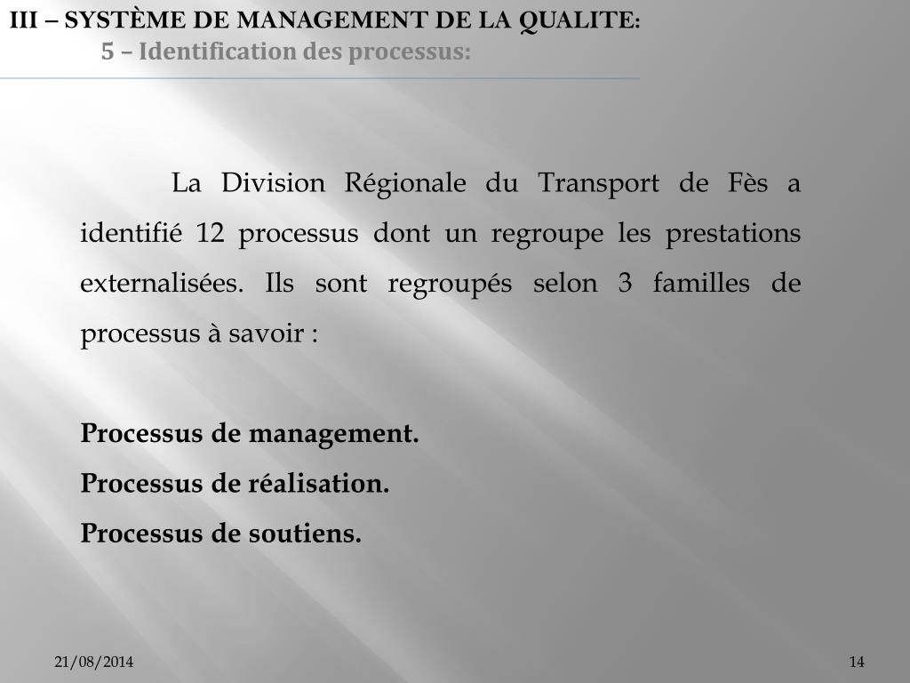 III – SYSTÈME DE MANAGEMENT DE LA QUALITE: 5 – Identification des processus: La Division Régionale du Transport de Fès a identifié 12 processus dont un regroupe les prestations externalisées. Ils sont regroupés selon 3 familles de processus à savoir : Processus de management. Processus de réalisation. Processus de soutiens.