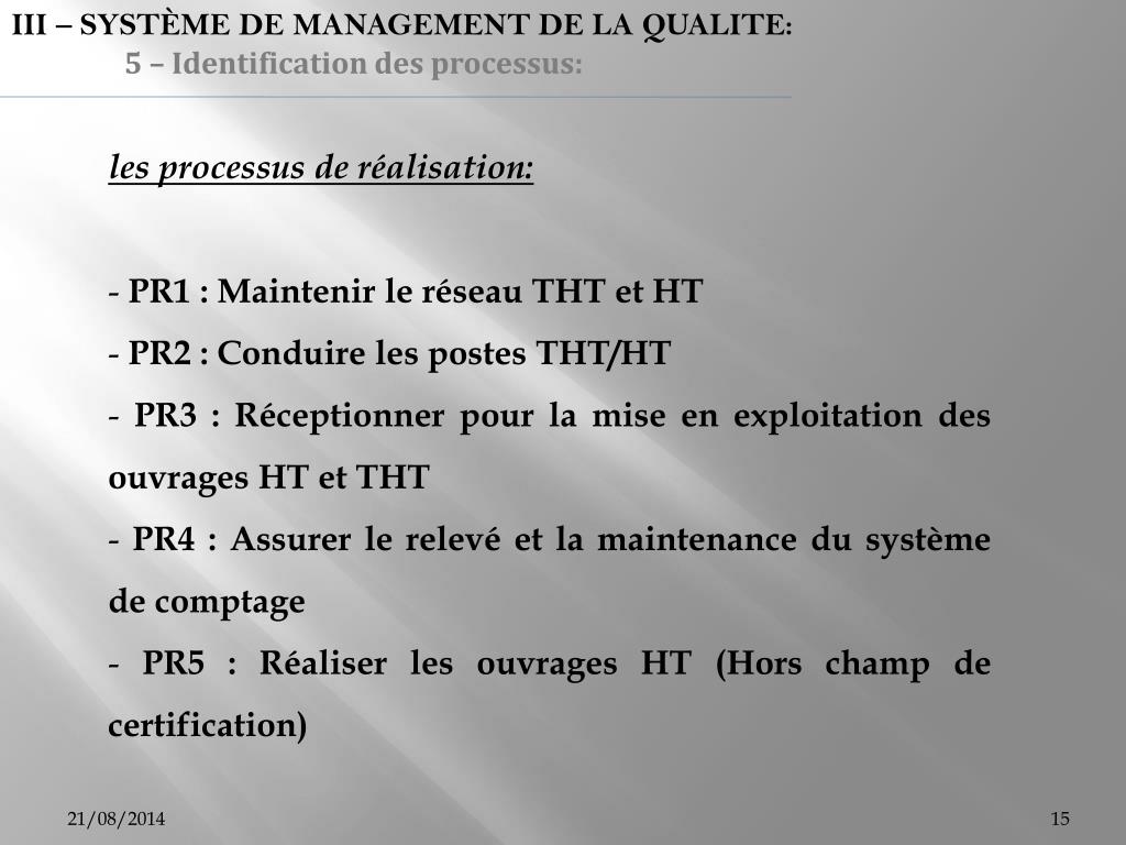 III – SYSTÈME DE MANAGEMENT DE LA QUALITE: 5 – Identification des processus: les processus de réalisation: - PR1 : Maintenir le réseau THT et HT - PR2 : Conduire les postes THT/HT - PR3 : Réceptionner pour la mise en exploitation des ouvrages HT et THT - PR4 : Assurer le relevé et la maintenance du système de comptage - PR5 : Réaliser les ouvrages HT (Hors champ de certification)