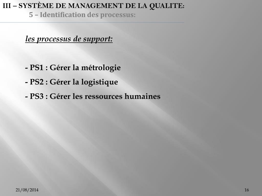 III – SYSTÈME DE MANAGEMENT DE LA QUALITE: 5 – Identification des processus: les processus de support: - PS1 : Gérer la métrologie - PS2 : Gérer la logistique - PS3 : Gérer les ressources humaines