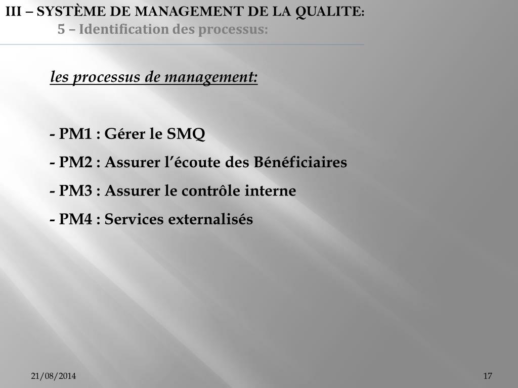 III – SYSTÈME DE MANAGEMENT DE LA QUALITE: 5 – Identification des processus: les processus de management: - PM1 : Gérer le SMQ - PM2 : Assurer l’écoute des Bénéficiaires - PM3 : Assurer le contrôle interne - PM4 : Services externalisés