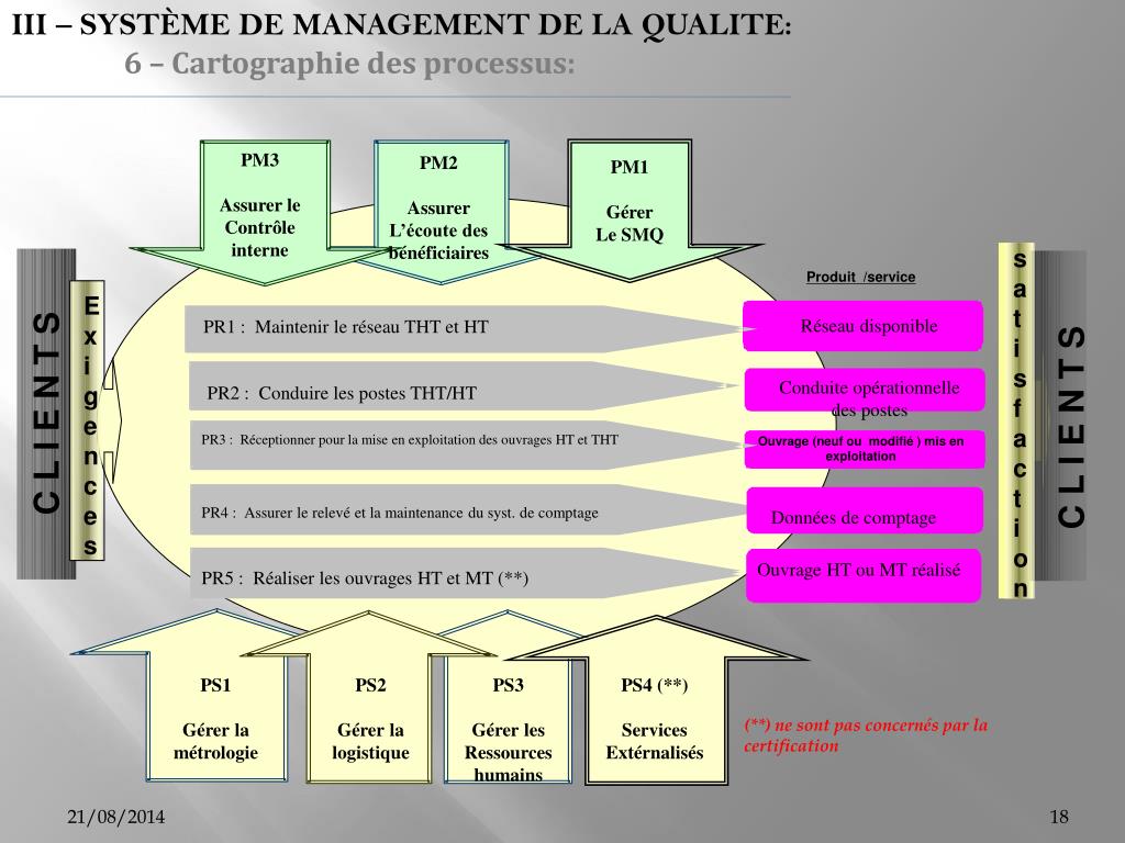 III – SYSTÈME DE MANAGEMENT DE LA QUALITE: 6 – Cartographie des processus: PM3 Assurer le Contrôle interne PM2 Assurer L’écoute des bénéficiaires PM1 Gérer Le SMQ Ex i gences Produit /service Réseau disponible PR1 : Maintenir le réseau THT et HT Conduite opérationnelle des postes PR2 : Conduire les postes THT/HT C L I E N T S C L I E N T S PR3 : Réceptionner pour la mise en exploitation des ouvrages HT et THT Ouvrage (neuf ou modifié ) mis en exploitation PR4 : Assurer le relevé et la maintenance du syst. de comptage Données de comptage Ouvrage HT ou MT réalisé PR5 : Réaliser les ouvrages HT et MT (**) PS1 Gérer la métrologie PS2 Gérer la logistique PS3 Gérer les Ressources humains PS4 (**) Services Extérnalisés (**) ne sont pas concernés par la certification satisfaction