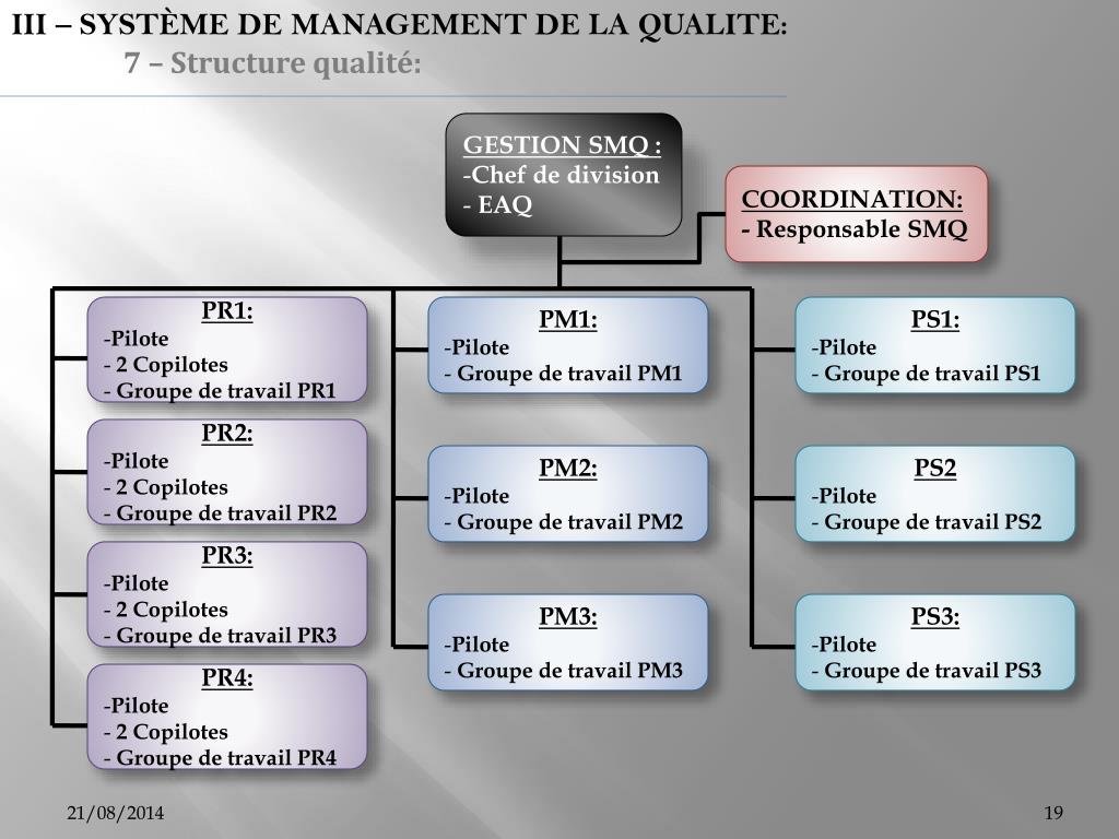 III – SYSTÈME DE MANAGEMENT DE LA QUALITE: 7 – Structure qualité: • GESTION SMQ : • Chef de division • EAQ COORDINATION: - Responsable SMQ • PR1: • Pilote • 2 Copilotes • Groupe de travail PR1 • PM1: • Pilote • Groupe de travail PM1 • PS1: • Pilote • Groupe de travail PS1 • PR2: • Pilote • 2 Copilotes • Groupe de travail PR2 • PM2: • Pilote • Groupe de travail PM2 • PS2 • Pilote • Groupe de travail PS2 • PR3: • Pilote • 2 Copilotes • Groupe de travail PR3 • PM3: • Pilote • Groupe de travail PM3 • PS3: • Pilote • Groupe de travail PS3 • PR4: • Pilote • 2 Copilotes • Groupe de travail PR4