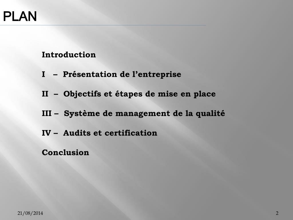 PLAN Introduction I – Présentation de l’entreprise II – Objectifs et étapes de mise en place III – Système de management de la qualité IV – Audits et certification Conclusion