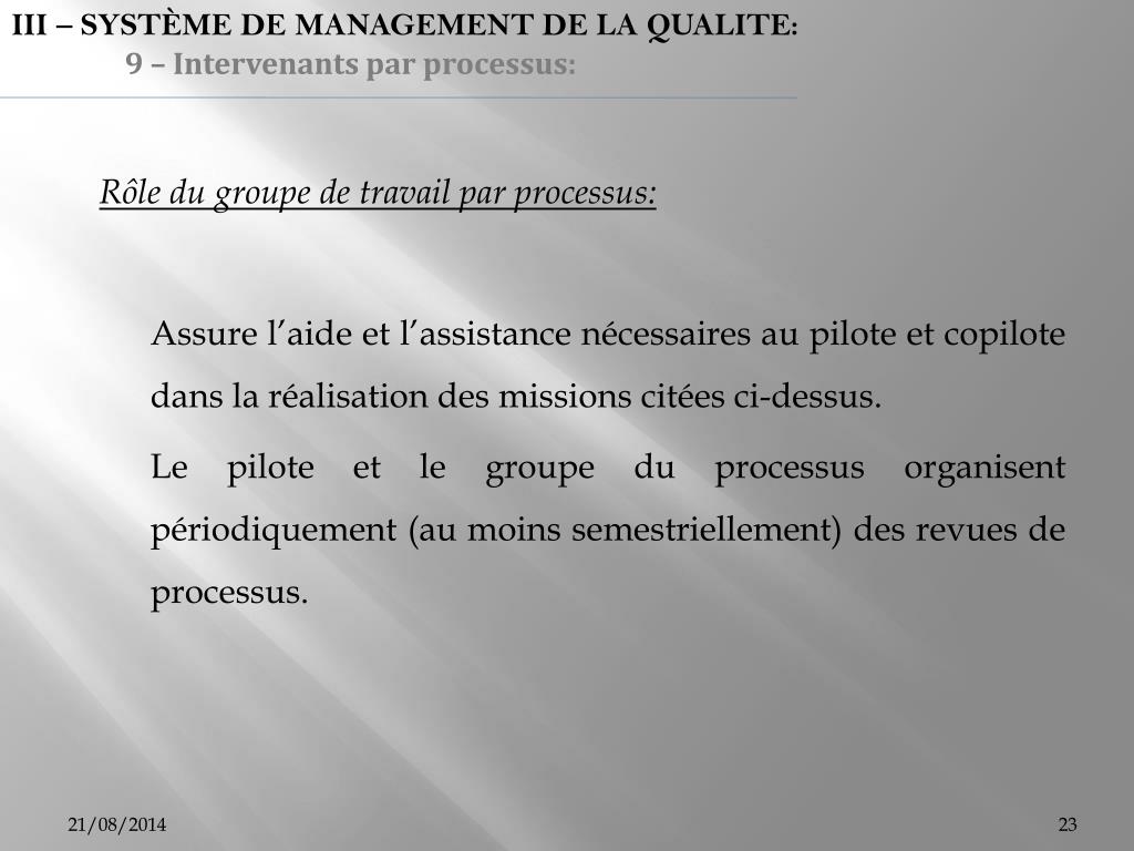 III – SYSTÈME DE MANAGEMENT DE LA QUALITE: 9 – Intervenants par processus: Rôle du groupe de travail par processus: Assure l’aide et l’assistance nécessaires au pilote et copilote dans la réalisation des missions citées ci-dessus. Le pilote et le groupe du processus organisent périodiquement (au moins semestriellement) des revues de processus.