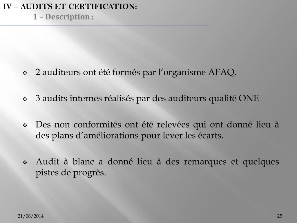 IV – AUDITS ET CERTIFICATION: 1 – Description : • 2 auditeurs ont été formés par l’organisme AFAQ. • 3 audits internes réalisés par des auditeurs qualité ONE • Des non conformités ont été relevées qui ont donné lieu à des plans d’améliorations pour lever les écarts. • Audit à blanc a donné lieu à des remarques et quelques pistes de progrès.