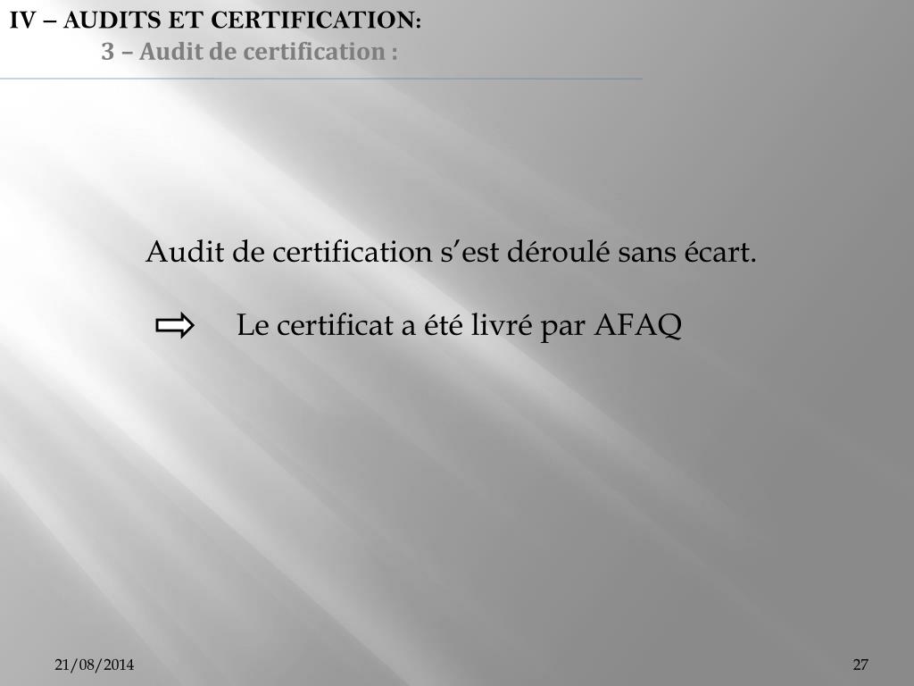 IV – AUDITS ET CERTIFICATION: 3 – Audit de certification : Audit de certification s’est déroulé sans écart. Le certificat a été livré par AFAQ