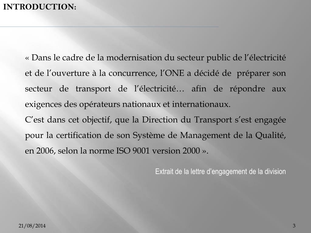 INTRODUCTION: « Dans le cadre de la modernisation du secteur public de l’électricité et de l’ouverture à la concurrence, l’ONE a décidé de préparer son secteur de transport de l’électricité… afin de répondre aux exigences des opérateurs nationaux et internationaux. C’est dans cet objectif, que la Direction du Transport s’est engagée pour la certification de son Système de Management de la Qualité, en 2006, selon la norme ISO 9001 version 2000 ». Extrait de la lettre d’engagement de la division