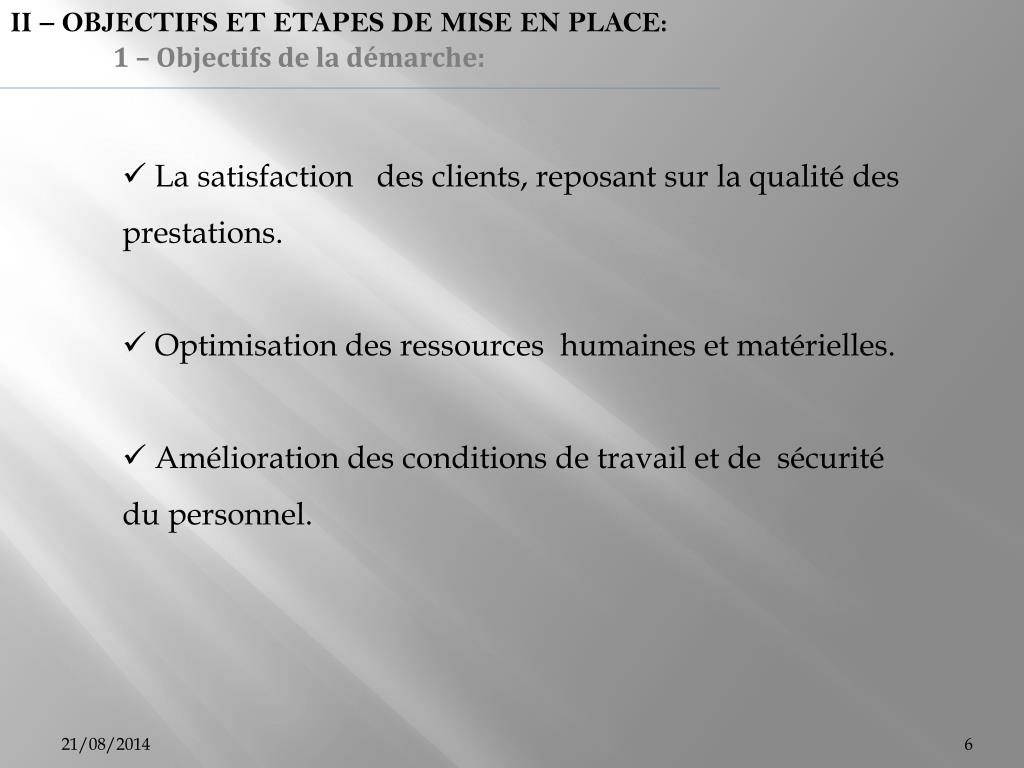 II – OBJECTIFS ET ETAPES DE MISE EN PLACE: 1 – Objectifs de la démarche: • La satisfaction des clients, reposant sur la qualité des prestations. • Optimisation des ressources humaines et matérielles. • Amélioration des conditions de travail et de sécurité du personnel.