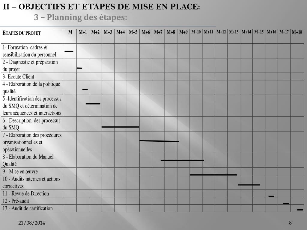 II – OBJECTIFS ET ETAPES DE MISE EN PLACE: 3 – Planning des étapes: