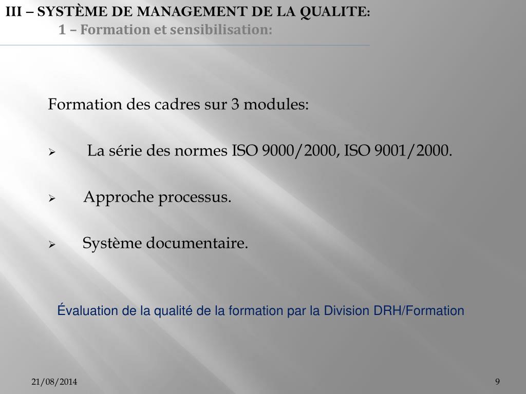 III – SYSTÈME DE MANAGEMENT DE LA QUALITE: 1 – Formation et sensibilisation: • Formation des cadres sur 3 modules: • La série des normes ISO 9000/2000, ISO 9001/2000. • Approche processus. • Système documentaire. Évaluation de la qualité de la formation par la Division DRH/Formation