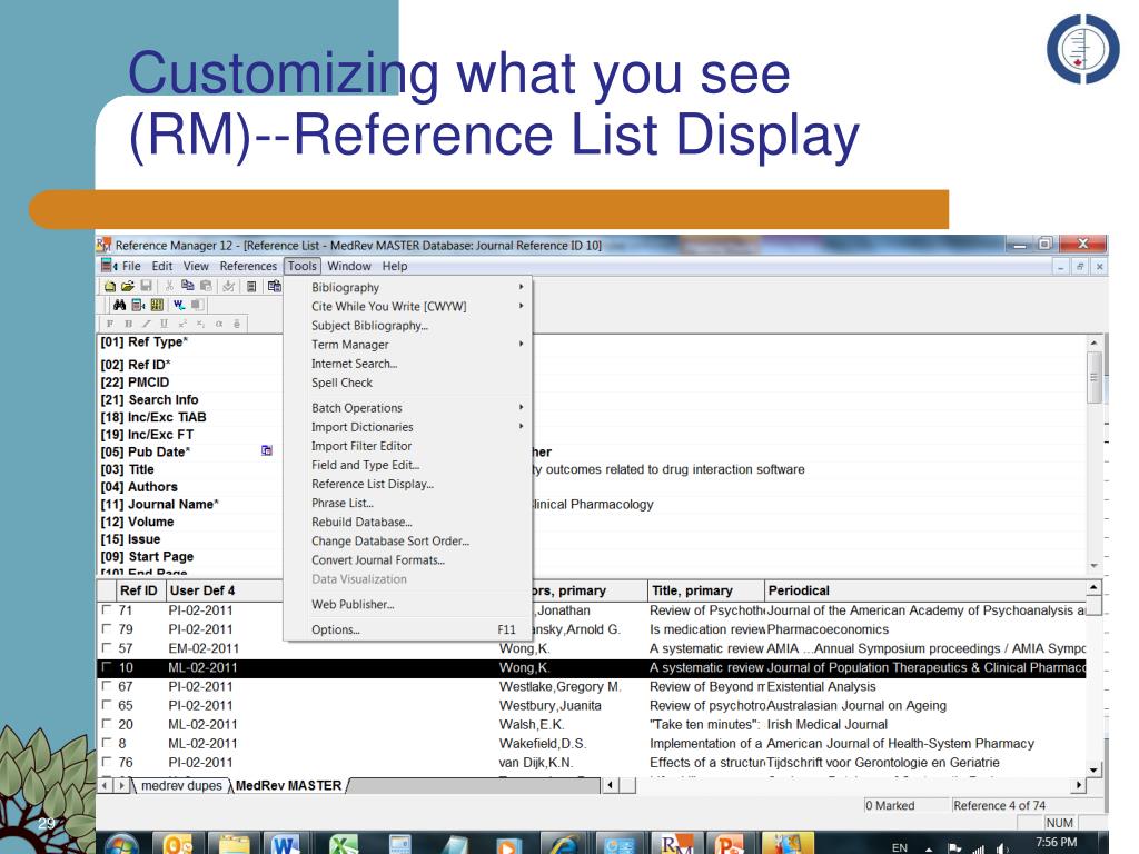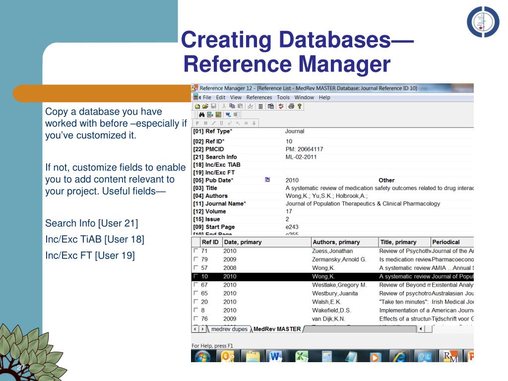 Creating Databases—Reference Manager Copy a database you have worked with before –especially if you’ve customized it. If not, customize fields to enable you to add content relevant to your project. Useful fields— Search Info [User 21] Inc/Exc TiAB [User 18] Inc/Exc FT [User 19]