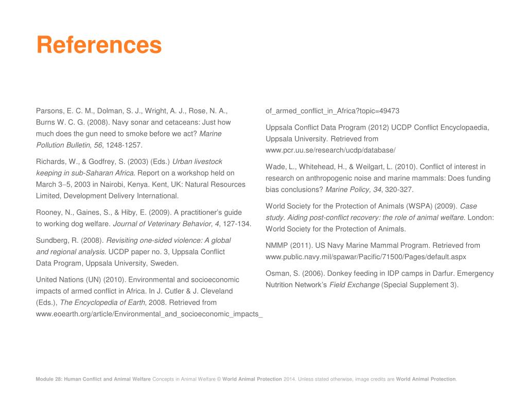 References Parsons, E. C. M., Dolman, S. J., Wright, A. J., Rose, N. A., Burns W. C. G. (2008). Navy sonar and cetaceans: Just how much does the gun need to smoke before we act? Marine Pollution Bulletin, 56, 1248-1257. Richards, W., & Godfrey, S. (2003) (Eds.) Urban livestock keeping in sub-Saharan Africa. Report on a workshop held on March 35, 2003 in Nairobi, Kenya. Kent, UK: Natural Resources Limited, Development Delivery International. Rooney, N., Gaines, S., & Hiby, E. (2009). A practitioner’s guideto working dog welfare. Journal of Veterinary Behavior, 4, 127-134. Sundberg, R. (2008). Revisiting one-sided violence: A global and regional analysis. UCDP paper no. 3, Uppsala Conflict Data Program, Uppsala University, Sweden. United Nations (UN) (2010). Environmental and socioeconomic impacts of armed conflict in Africa. In J. Cutler & J. Cleveland (Eds.), The Encyclopedia of Earth, 2008. Retrieved from www.eoearth.org/article/Environmental_and_socioeconomic_impacts_of_armed_conflict_in_Africa?topic=49473 Uppsala Conflict Data Program (2012) UCDP Conflict Encyclopaedia, Uppsala University. Retrieved from www.pcr.uu.se/research/ucdp/database/ Wade, L., Whitehead, H., & Weilgart, L. (2010). Conflict of interest in research on anthropogenic noise and marine mammals: Does funding bias conclusions? Marine Policy, 34, 320-327. World Society for the Protection of Animals (WSPA) (2009). Case study. Aiding post-conflict recovery: the role of animal welfare. London: World Society for the Protection of Animals. NMMP (2011). US Navy Marine Mammal Program. Retrieved from www.public.navy.mil/spawar/Pacific/71500/Pages/default.aspx Osman, S. (2006). Donkey feeding in IDP camps in Darfur. Emergency Nutrition Network’s Field Exchange (Special Supplement 3).